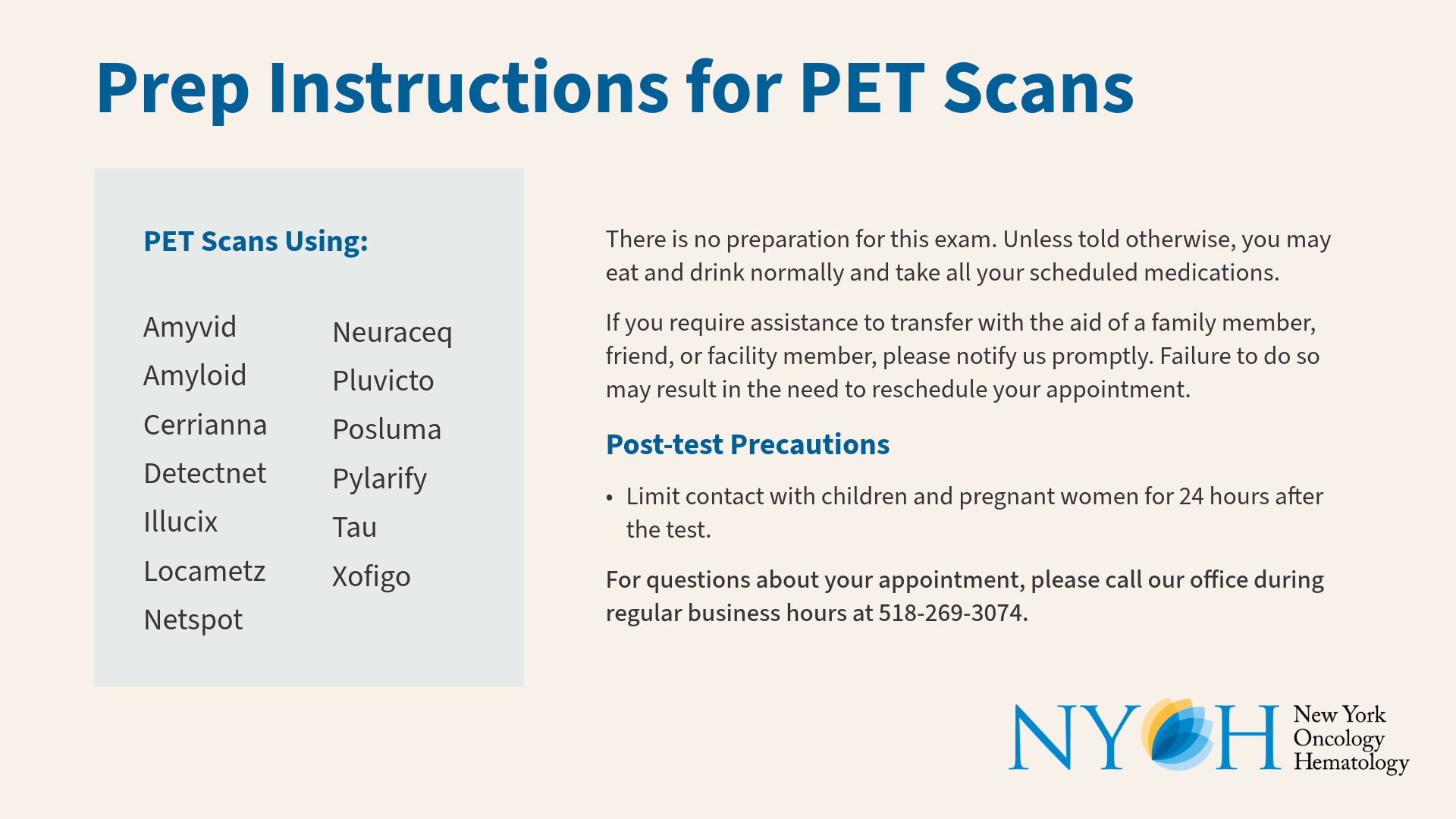Need to cancel? Call (518) 269-3074 by 3:00 p.m. the day before your scan. Your injection is specifically prepared for you and must be discarded if unused, which may result in additional charges.